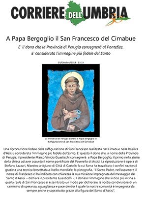 Con orgoglio e commozione, siamo fieri di annunciarvi che oggi verrà donata una nostra opera a Papa Francesco in visita ad Assisi. Si tratta di una pictografia su calce con il ritratto ritenuto il più vicino al vero volto di San Francesco. L’opera originale è stata dipinta da Cimabue nel XIII sec. e si trova […]